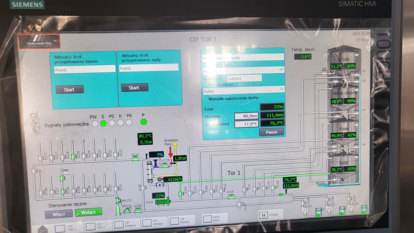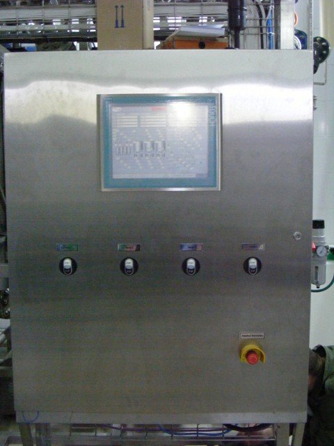 In the stainless steel box, the controller and all the other elements of controlling are placed, together with power circuits and pneumatics. On the front of the box, there is an additional manual panel TOUCH MULTIPANEL produced by the SIEMENS company and with its help an operator of the cleaning station chooses particular cleaning programmes and observes the progress of cleaning cycles. On the panel, cleaning processes carried out by the CIP station are visible.